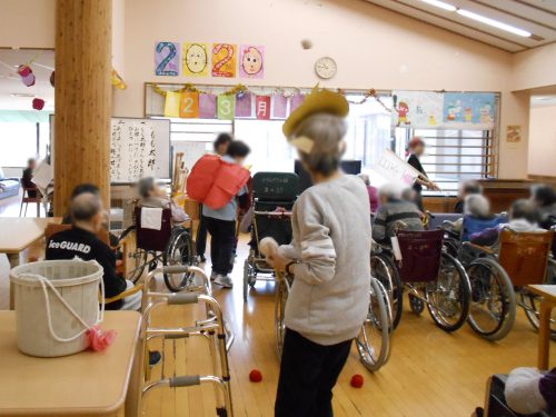 ☆2階では、『桃太郎』のお話になぞらえて鬼退治(豆まき)をしました。桃太郎・鬼役は職員。猿・犬・キジ役は利用者さん。