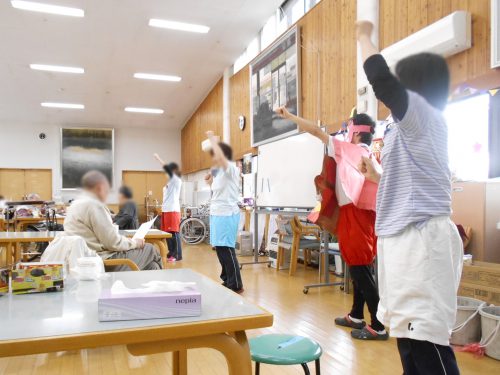 ☆デイケアでは、『鬼のパンツ』『豆まき』を歌ってから豆まきをしました。〝職員は、鬼のパンツを履きました。