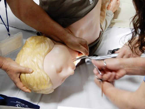 理事長から「誤嚥は頻繁に起こるものではないが、起こった場合の処置はいっときを争う。職種に関係なく、遭遇した場合、誰もが、医師が到着するまでの間の救急の対応ができるよう学習が必要。処置道具も点検しておき、すぐに使えるよう、また、取り出しやすい場所に配置するように」とお話がありました。