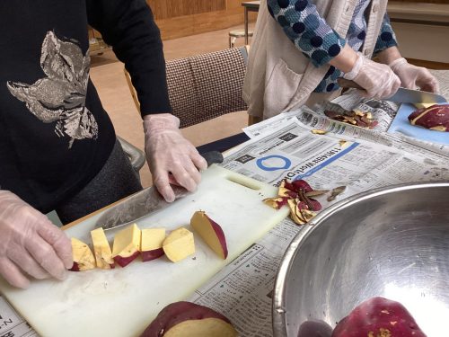 さつまいも調理をしました。蒸して召し上がっていただきました。畑で採れたさつまいもは大きくて切るのに苦労しましたが、ご利用者様は「椅子に座って切っていると力が入らない」と立って切っていました。